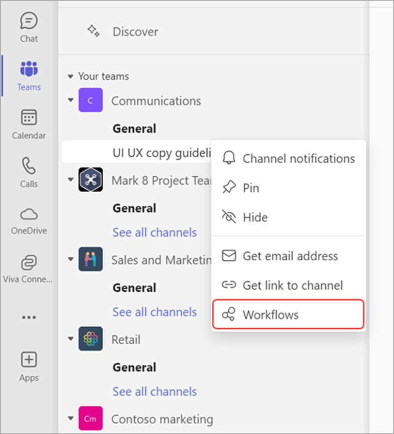 Select More options next to the channel or chat you want to create a workflow for, and then select Workflows.