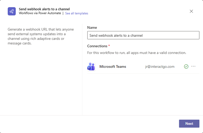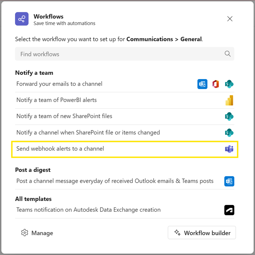 Note: The webhook template Post to a chat when a webhook request is received may not be available depending on your organization type. For more help, contact your IT admin.