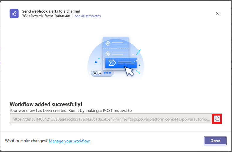 Once the workflow is created, you’ll see a new dialog with the URL that you can copy.