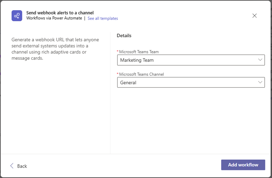 On the next page you’ll be able to choose the Channel that this notification will post to. Note if you are using this workflow from a channel these fields will auto-populate for you. After filling out the required details, select Add workflow.