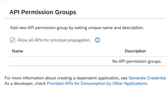 API Permission (Provided APIs > API Permissions Groups > Allow all APIs for principal propagation) - Enabled